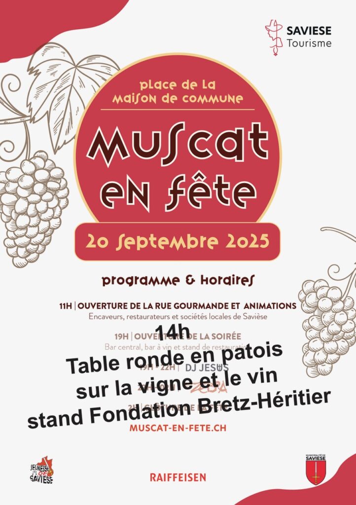 Cette table ronde organisée par le Fondation Bretz-Héritier dans le cadre de la manifestation "Muscat en fête" vous permettra d'en savoir plus sur la vigne et le vin de la commune de Savièse.